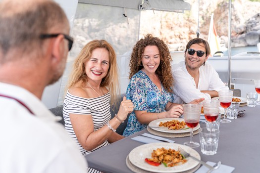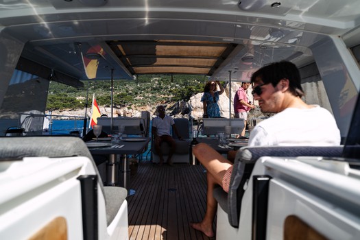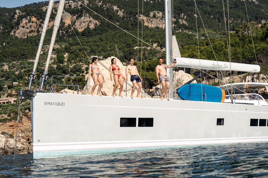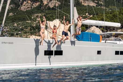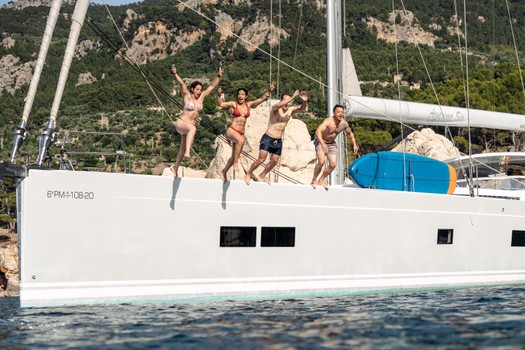 Bimini, Bow thruster, Cockpit speakers, Cockpit table, Dinghy, Electric windlass, Teak cockpit, Teak deck, Fishing equipment, Cockpit cushions, Swim ladder, Bathing platform, Foredeck sun cushions, Kit wakeboard, Hydraulic passerelle, Gangplank, Diving mask, Gangway, Loudspeaker (outside).